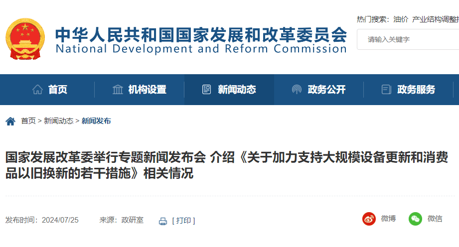 7月25日下午,國家發展改革委舉行專題新聞發布會,就加力支持企業設備更新,消費品以舊換新政策銜接、支持范圍、對消費市場的影響,等方面問題回答記者提問。