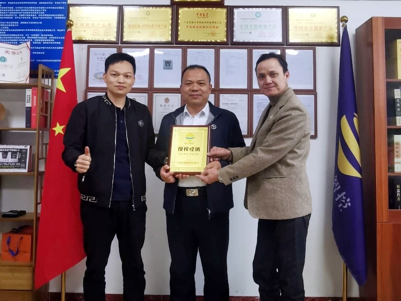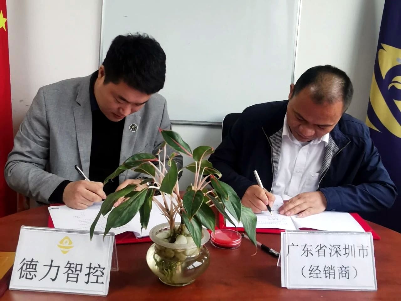 在簽約儀式上,我司德力智控總經理韓總與黃總進行了簡單而隆重的現場簽約,隨后由我司德力智控副總經理鐘總授予黃總“特許經銷”牌。雙方在產品創新、營銷創新、品牌合作等方面達成戰略共識。同時,本次簽約儀式不僅是我司德力智控不斷尋求優質合作伙伴、謀求共同發展的縮影,也是我司德力智控加大市場投入的著力點。
