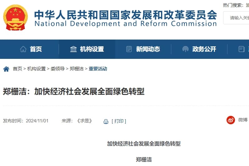 近日,《求是》雜志發表國家發改委黨組書記、主任鄭柵潔署名的文章《加快經濟社會發展全面綠色轉型》。